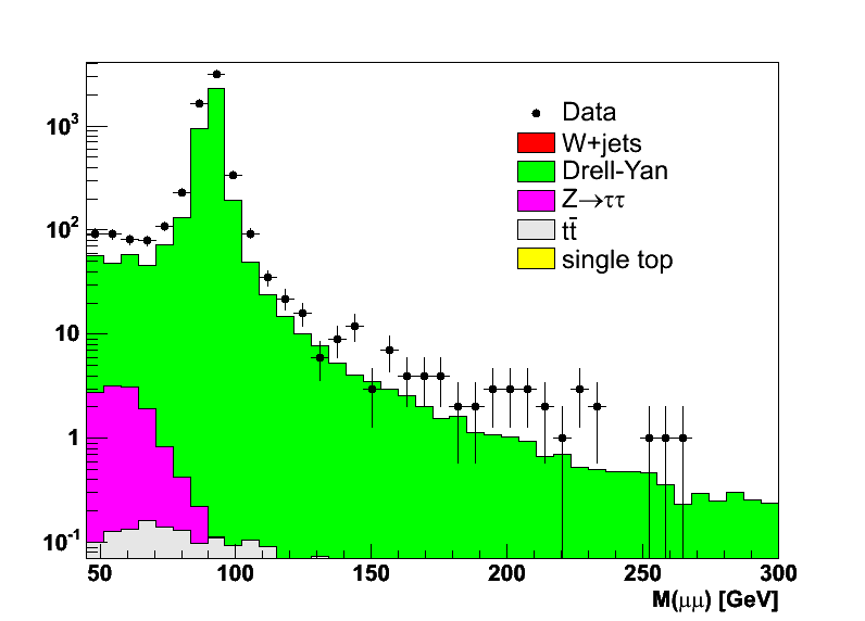 For Z’s with the selection 2 CMUP with pT>20 GeV: n(BG)=4011 and n(Data)=6224. Below is the dimuon invariant mass,