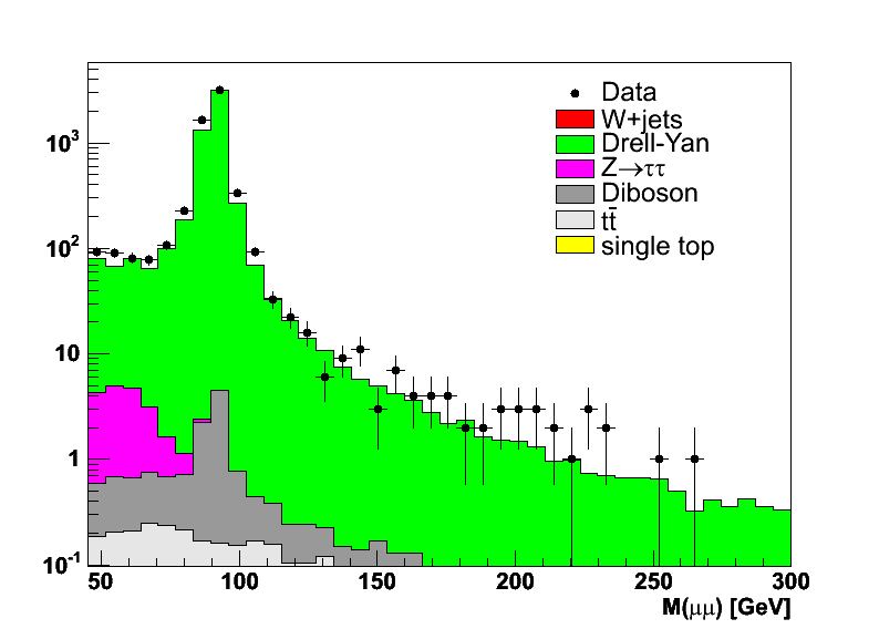 As a first basic check of our background modelling, alpgen cross sections, whether I have made a massive mistake, etc., I look at inclusive Z’s and W’s in the CMUP (CMUP-CMUP in the case of Z’s) sample. I do not have the QCD contribution included, but it should be negligible for the muons. I also do not have dibosons, but their cross section is small. I expect agreement in the ~5% range. Instead I see the following,